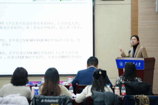 秦珞涵主任从对外经贸商公司国际认证的情况入手,介绍了对外经贸大学的认证情况,将三大国际认证进行异同点分析,对其侧重点与难点、认证时间经费与结果,及标准的区别进行全面进行讲解。她同时讲述了如何做好国际认证准备工作,帮助参会院校进一步了解现场访视的前期工作。