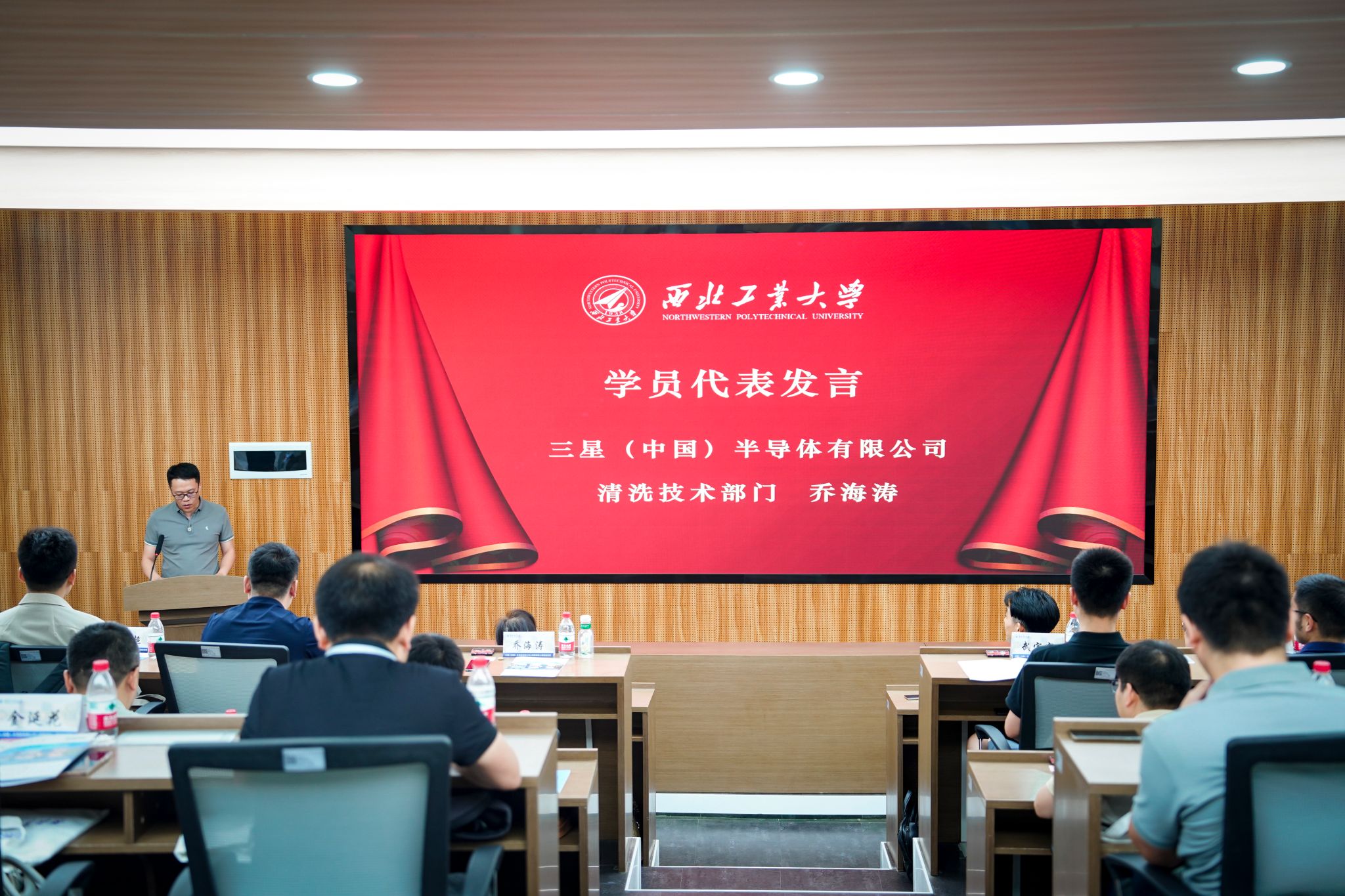 三星(中国)半导体有限公司清洁技术部门资深主任工程师乔海涛作学员代表发言,他首先感谢公司给予的此次参训机会以及williamhill英国威廉希尔提供的良好学习氛围及培训资源,并表示将秉承三星(中国)半导体有限公司快速发展及高效运转的企业理念,与各位同事携手共进、比肩同行,在williamhill英国威廉希尔这所全国名校共同学习思考,相互交流启发,把学习成果转化成工作思路、工作动力。