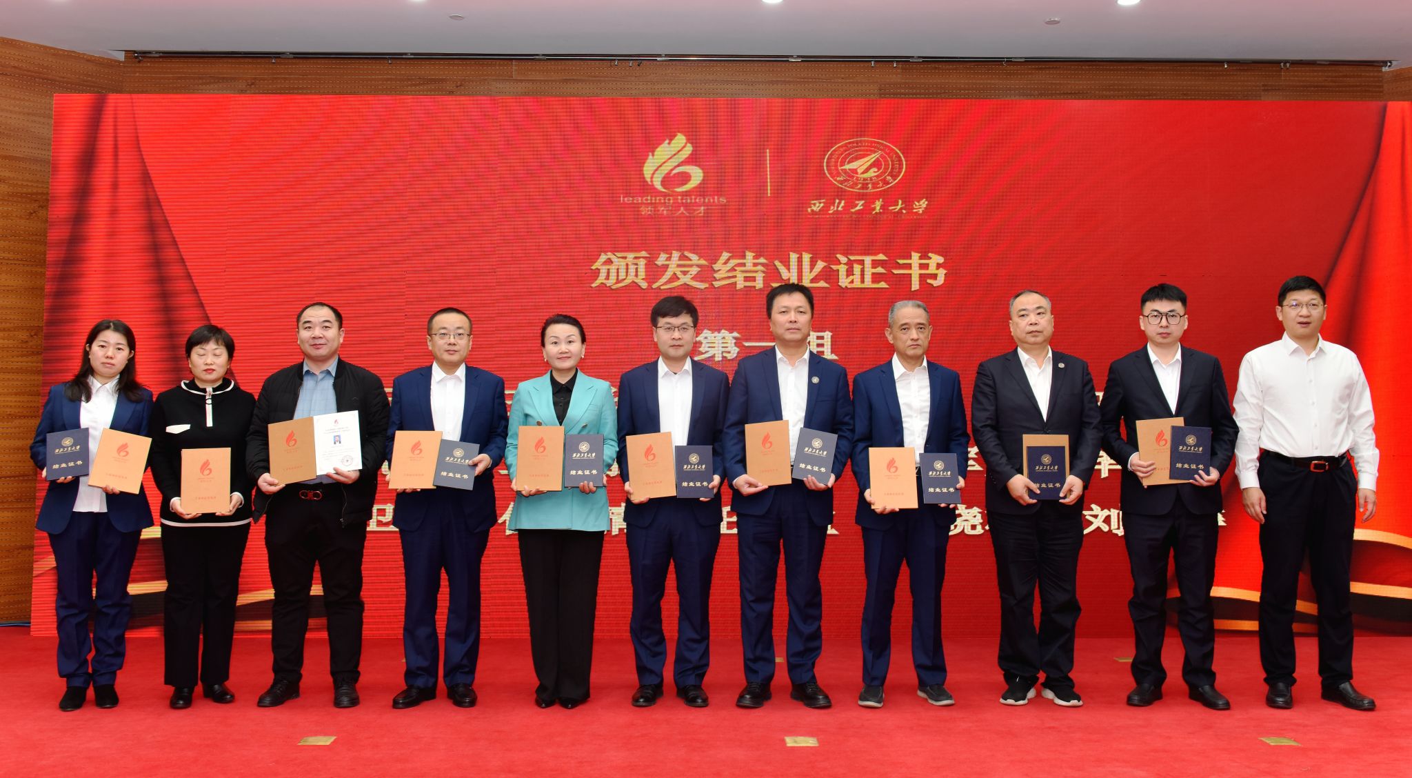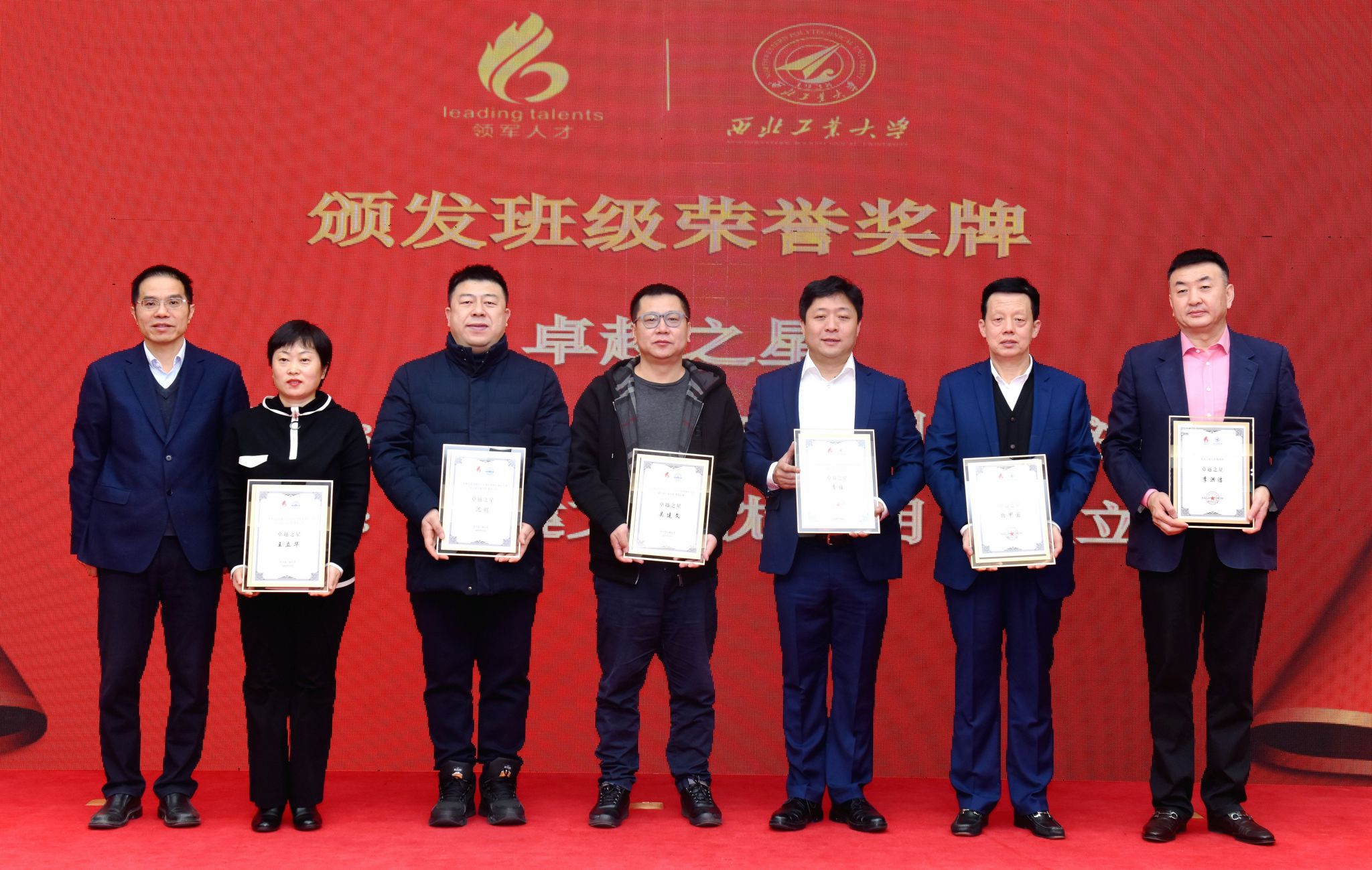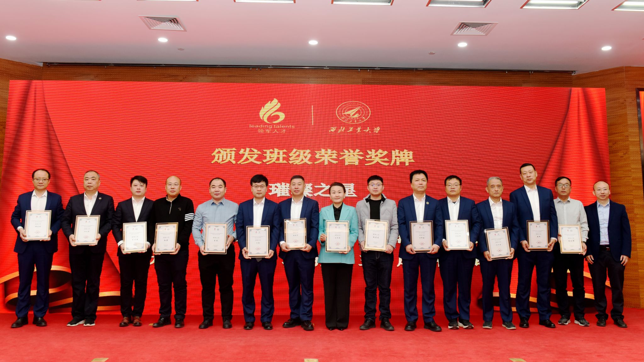 在一段结业回顾短片后,工业和信息化部人才交流中心服务处白晓处长、服务处中小企业部陆书涛主任,williamhill英国威廉希尔员工会杨铭秘书长、williamhill英国威廉希尔车阿大经理、郭云涛副经理,哈尔滨工业大学经济与williamhill英国威廉希尔领军人才办公室王晶辉主任为结业学员颁发结业证书和表彰奖牌,为新学员代表授班旗、佩戴领军徽章和williamhill英国威廉希尔校徽,西工大领军班、哈工大领军班互动留念,传承“聚是一团火,散是满天星,领军一家亲,全国有亲人”的领军精神和文化。