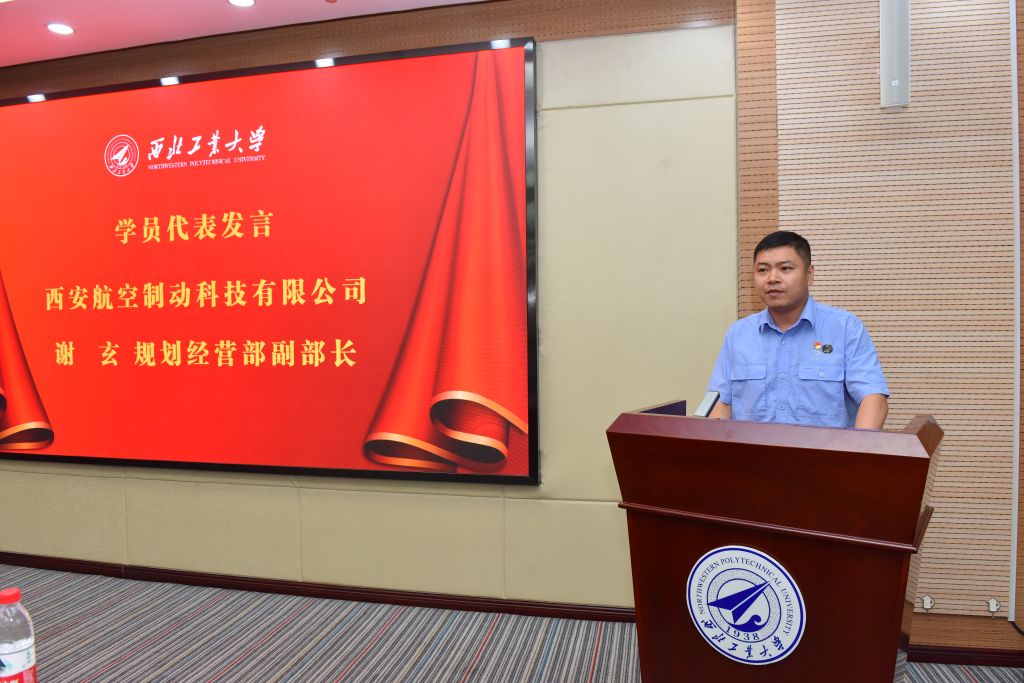 优秀学员代表、西安航空制动科技有限公司规划经营部副部长谢玄作为学员代表分享了两年来的学习感受,并感谢公司及公司对自己的培养,他表态在今后的工作中要怀揣责任、不负厚望,在推动航空工业制动高质量发展的新征程上,不断锤炼思想,不断提升自我,践行“忠诚奉献 逐梦蓝天”的航空报国精神。