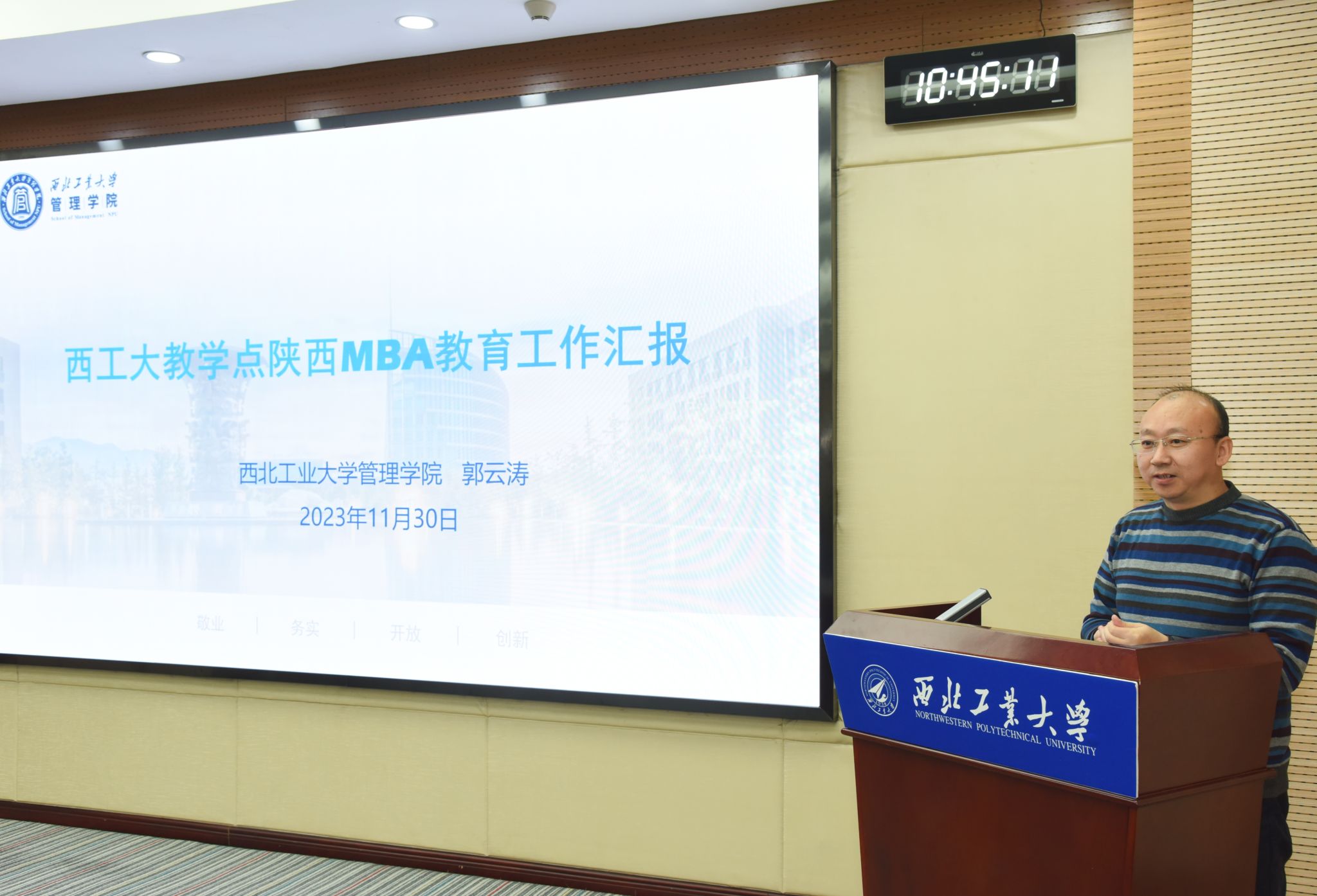在各教学点工作汇报阶段,来自西安交通大学等7所教学点的领导和代表分别结合各自办学实际,详细介绍了各教学点2023年陕西MBA教育工作的开展情况,展示特色和亮点,总结经验与不足,查找存在问题,梳理2024年度工作思路。williamhill英国威廉希尔副经理郭云涛代表西工大教学点做了工作汇报,主要围绕建设聚焦产业需求、衔接职业认证的课程体系,打造校企协同、理论实践融合的双导师队伍,搭建实践基地和重点赛事的实践育人平台,构建人才培养全过程质量保障监督机制四个方面,汇报了了西工大教学点在MBA人才培养方面的做法,并以教育质量提升为目标提出持续改进措施。