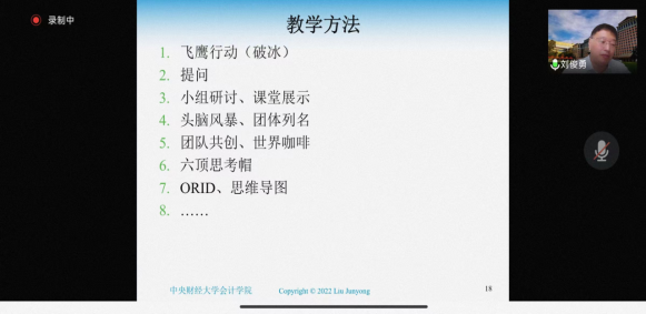 刘俊勇教授的分享围绕“什么是行动学习”、“教师如何在课堂中应用行动学习”、“教师如何在社会服务项目中应用行动学习”、“公司如何在人才发展中应用行动学习”四部分内容展开,他以《管理会计》课程作为切入点,细致而生动地介绍了他在行动学习方面多年的探索与实践过程与经验。刘教授将行动学习六个基本要素归纳为:1、项目、挑战、任务或问题;2、规模为4-8人的小组,想法各异;3、互动式的提问与倾听;4、指定策略与采取行动;5、学习承诺;6、行动学习教练(催化师),并详细介绍了将行动学习(Action Learning,AL)与云班课(MOSO)等云教学平台相结合的奥云教学法(ALMOSO),在此基础上提出7项行之有效的教学方法:1、飞鹰行动(破冰)2、提问;3、小组研讨、课堂展示;4、头脑风暴、团队列名;5、团队共创、世界咖啡;6、六项思考帽;7、ORID、思维导图。