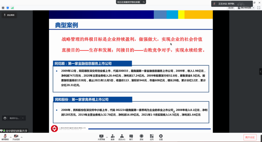 为了加深同学们对战略管理的理解,将理论学习与企业实践有效联系,11月7日下午,公司企业导师、MBA员工、上海玖禄源金融信息服务有限公司执行董事、总经理周学群先生走进课堂,为同学们呈现了《利用资本市场实现企业战略》的课程专题分享。