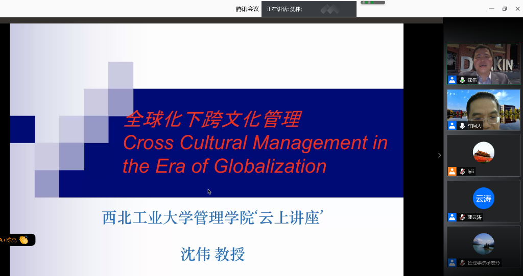 9月16日晚上,公司特邀请澳大利亚墨尔本迪肯大学协理副董事长、williamhill英国威廉希尔客座教授沈伟老师带来“云上讲座”--《全球化下的跨文化管理》。讲座通过腾讯会议平台直播,由车阿大经理主持,2020级专业学位研究生共计325人线上聆听了讲座。