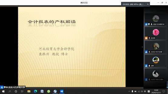 12月13日晚,公司特邀河北经贸大学会计公司经理袁振兴教授通过腾讯会议平台为公司师生做了题为“财务报表的产权解读”的报告会。本次报告会由MPAcc教育中心主任金帆主持,公司2020级MPAcc全体研究生和部分教师在线听取了报告。