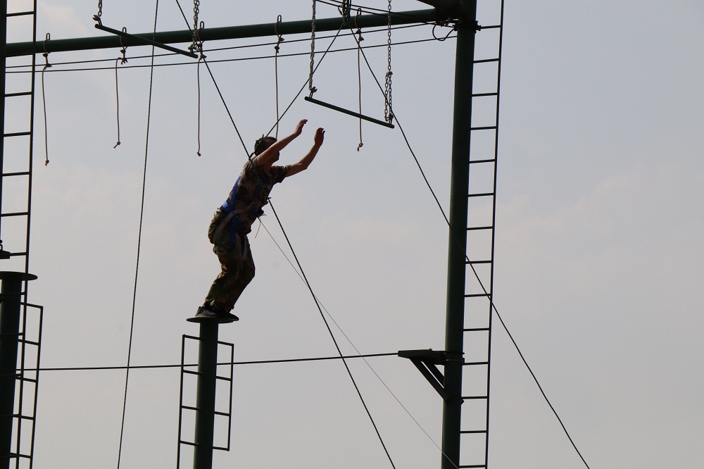 跳出真我挑战极限项目,需要爬上9米高的圆柱,站上晃动不止仅能容纳一人的顶端圆盘上,再跳跃出去,抓住悬在头顶上的单杠,最后自然下落。队员们克服烈日的曝晒及高空的恐惧,挑战自我。