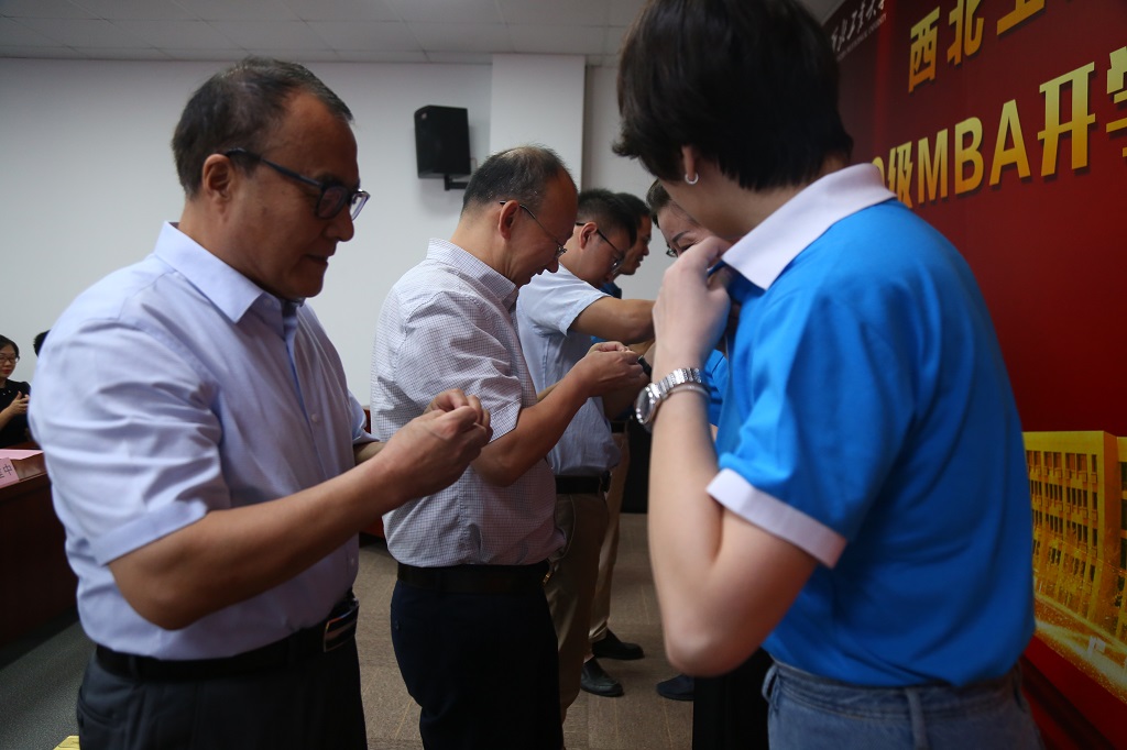 随后,由四位导师为新生代表佩戴校徽并授予班旗。2019级MBA新生代表徐加生,代表全体新生进行发言,他表示:我们来自五湖四海,但初心一致,希望在以后的学习生活中,不仅能够收获知识,收获友谊,更能一起碰撞出创新的火花,彼此帮扶,锐意进取。