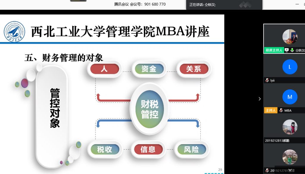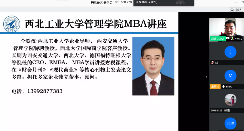 4月19日上午,公司特邀企业导师仝铁汉教授带来首场“云上讲座”---《疫情防控时期企业财务管控方略》,讲座通过腾讯会议平台直播,由陈琳教授主持,2019级专业学位研究生MBA、MEM、MPAcc共计226人线上聆听了讲座。