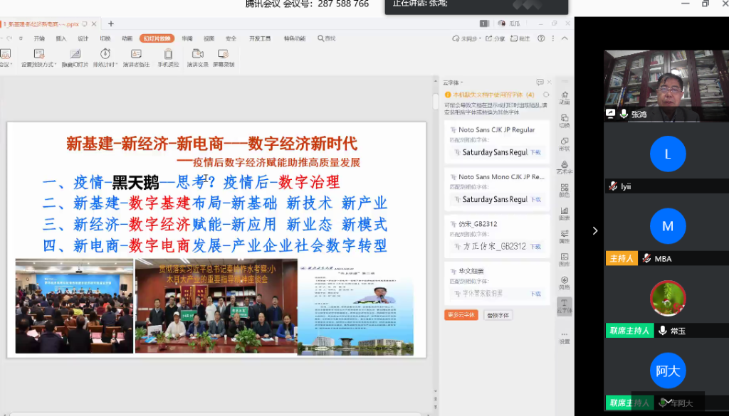 4月24日晚,公司特邀陕西省教学名师张鸿教授带来第二场“云上讲座”---《新基建·新经济·新电商--数字经济新时代》,讲座依旧采用腾讯会议平台直播,由经理车阿大教授与常玉教授联席主持,在线聆听的研究生近200人。