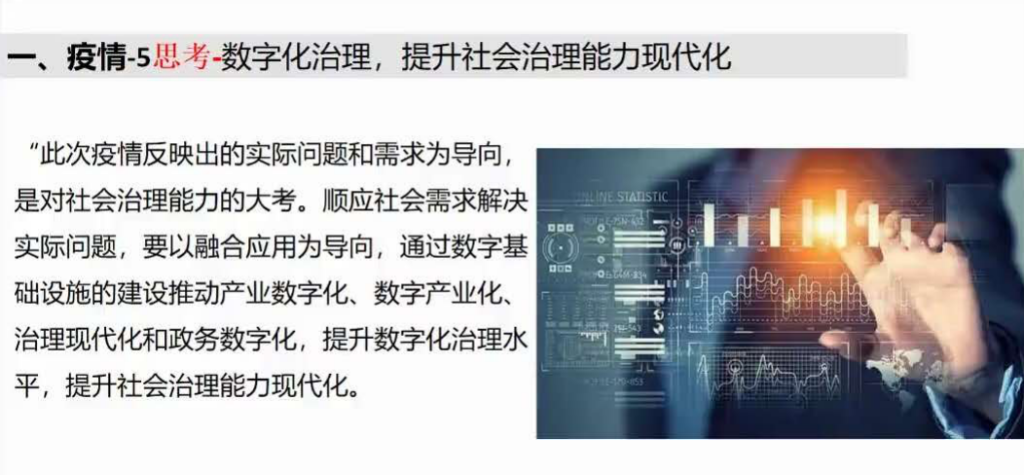 张老师从个人对疫情的深入思考出发,认为在抗击新冠疫情的过程中,数据生产要素的数字经济平台起到了相当重要的支撑作用,而疫情结束之后,提升数字化治理水平也将成为各方的重点工作。