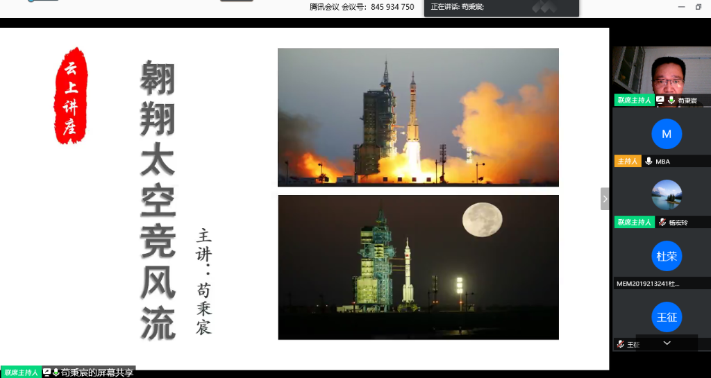 5月15日晚,公司机电公司苟秉宸教授受邀为公司专业学位研究生做了《翱翔太空竞风流---中国载人航天事业的亲历与思考》专题讲座。讲座由MBA/MEM教育中心主任杨宏玲主持,百余名员工通过腾讯会议软件在线聆听了讲座。