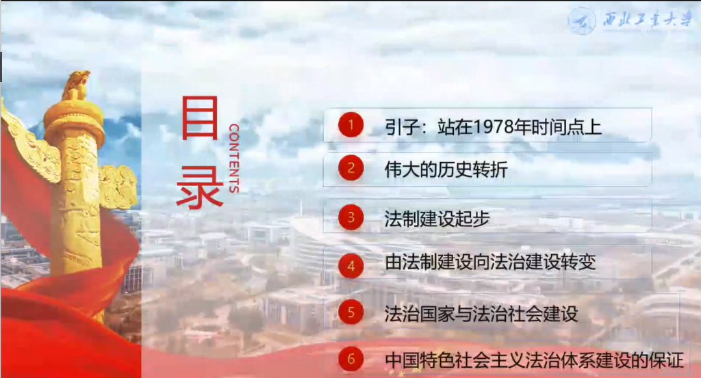 丁教授的讲授内容丰富详实,他结合大量珍贵的历史图片和材料,让同学们对我国改革开放以来的法治建设有了系统而全面的了解,对中国共产党的百年奋斗历程和伟大成就也有更深刻的体会。通过讲座,使同学们认识到我国推进依法治国的决心,深刻的理解依法治国是发展中国特色社会主义市场经济,促进社会生产力发展的客观要求;是推进精神文明建设,促进社会全面进步的内在需要;是促进社会主义民主政治建设,发扬社会主义民主的根本保证;是国家稳定,长治久安的关键所在。在新时代,要坚定信念,坚定“四个自信”,坚持依法治国。