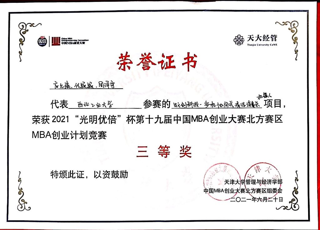6月20日,2021“光明优倍”杯第十九届中国MBA创业大赛北方赛区决赛在天津大学举行。由公司应允强、代颖颖、周泽宇组成的“蚁创科技---多机协同式清洁消杀机器人”项目团队,在王颖晖、沙清华、顾振芳老师的指导下,经过激烈的角逐在北方赛区决赛中荣获三等奖。