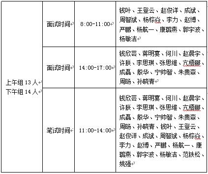 (1)考生分为上午面试组、下午面试组,上、下午面试组的笔试将安排在中午11:00-14:00进行(12:00-13:00午餐时间),请上、下午面试的考生务必注意笔试时间准时参试。